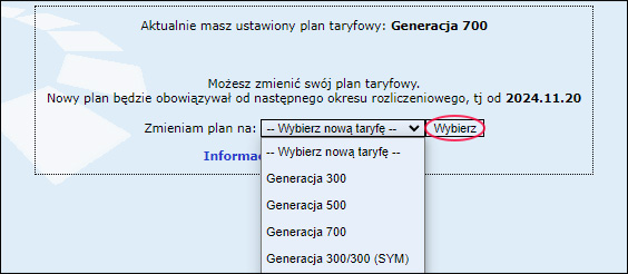 Po prawej stronie pojawi się lista, z której należy wybrać interesujący nas plan taryfowy i potwierdzić nasz wybór przyciskiem Wybierz: