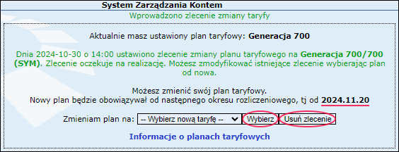 Po zatwierdzeniu wyboru pojawi się informacja o wybranym planie taryfowym oraz datą, od której plan ten będzie obowiązywał. Jeżeli źle wybraliśmy to możemy ponownie wybrać inny plan taryfowy z listy (Wybierz) lub po prostu usunąć nasze zlecenie (Usuń zlecenie):